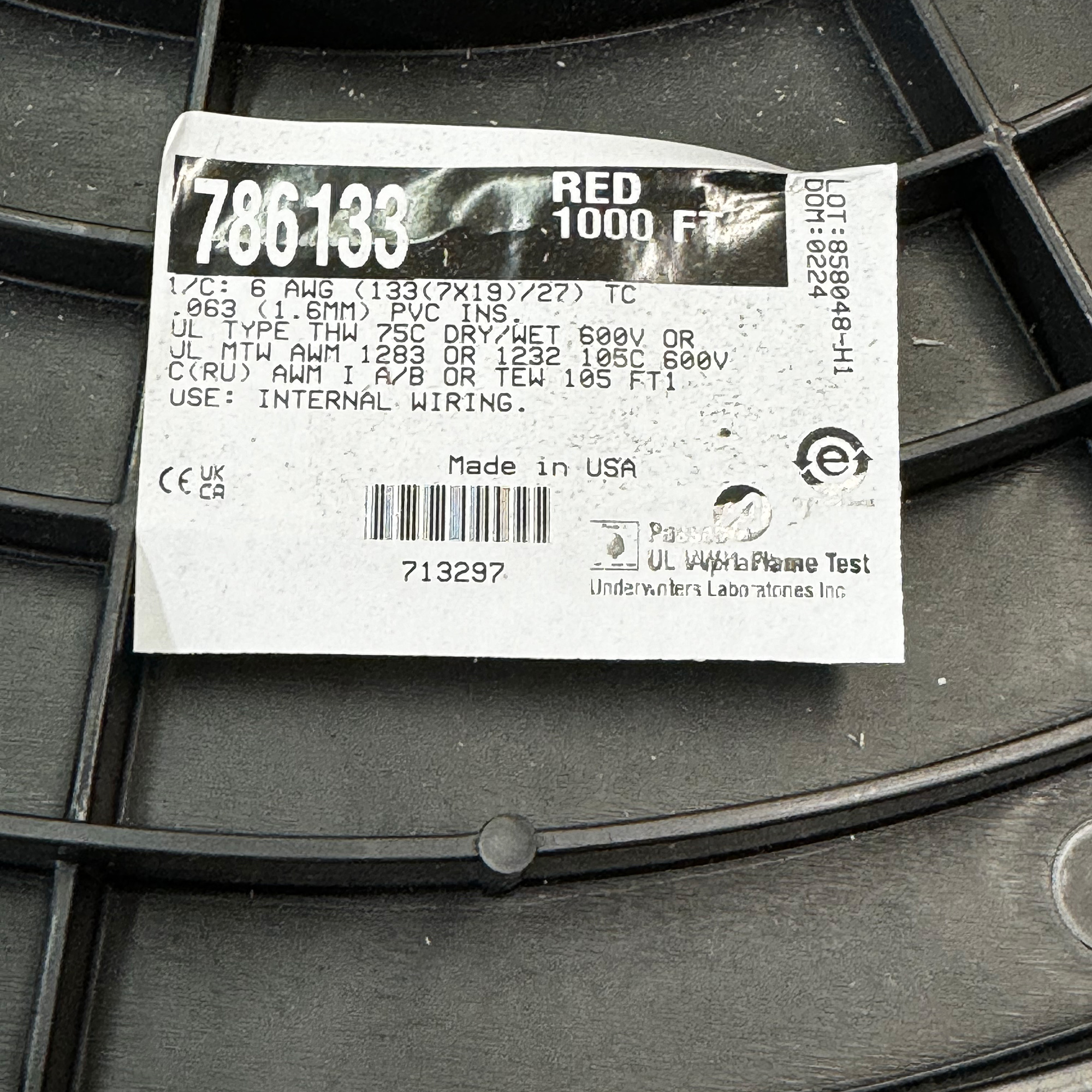 786133 BLACK 1000 FT 1/C: 6 AWG (133(7X19)/27) TC .063 (1.6MM) PVC INS. JL TYPE THW 75C DRY/WET 600V OR UL MTW AWM 1283 OR 1232 105C 600V C(RU) AWM I A/B OR TEW 105 FT1 USE: INTERNAL WIRING. Made in USA